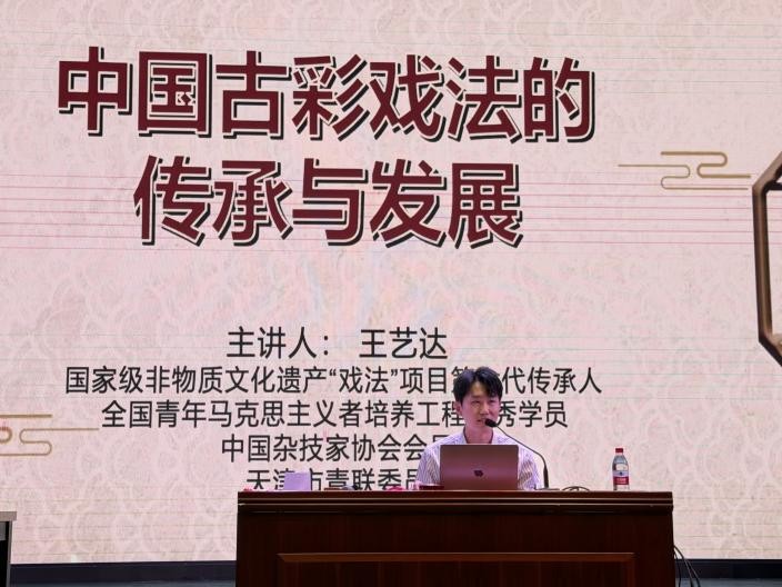 讲授中,王艺达结合自身学艺的艰辛历程,讲述了一名非遗传承人如何在坚守传统中砥砺匠心。他简要梳理古彩戏法的历史脉络与艺术特色,通过《六连环》等多个经典节目现场展示,生动展现这项千年技艺的独特魅力。