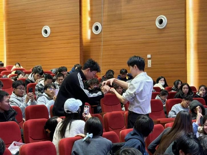 讲授过程中,王艺达邀请学生上台参与表演,并走下台与同学们近距离交流,亲身示范戏法基本手法,讲解技巧背后的传统文化意蕴。台上台下气氛热烈,掌声不断,学生们在沉浸式参与中感受传统艺术的魅力与智慧。