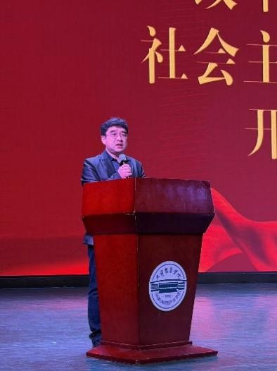 在大学生活动中心报告厅,国家级非物质文化遗产“戏法”项目第六代传承人王艺达以“弘扬中华优秀传统文化——中国古彩戏法的传承与创新”为题,与我院教师交叉登台,带来一堂融合优秀传统文化与时代精神的特色思政课。我院“概论”课教研室主任仲地锋参与讲授,2025级500余名本科生认真聆听。